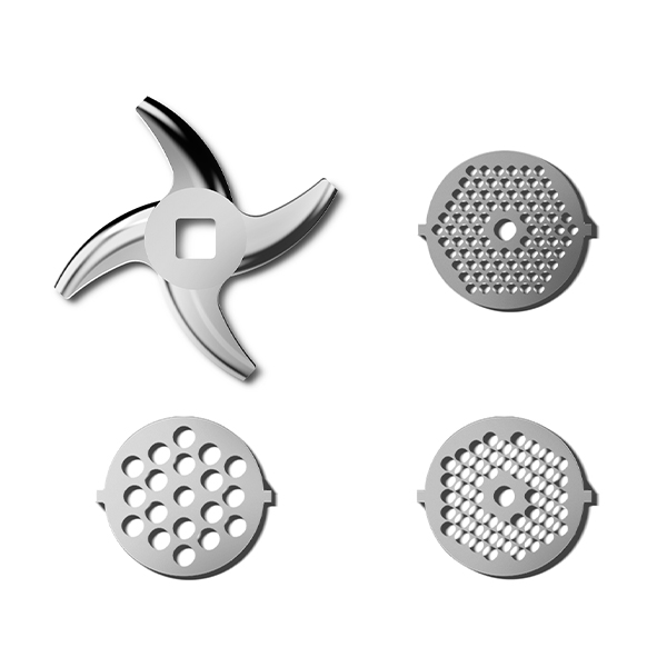 Моторный блок, блок мясорубки, шнек мясорубки, нож мясорубки, фиксирующее кольцо, перфорированные диски для различных видов фарша (2 шт.), загрузочный лоток, крышка загрузочного лотка, система хранения насадок, толкатель, основание насадки для кеббе и колбасок, формирующая насадка для приготовления кеббе, формирующая насадка для приготовления колбасок, приспособление для очистки дисков мясорубки, руководство по эксплуатации, гарантийный талон