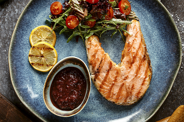 Маринад для лосося: Смешайте 1 ст.л. оливкового масла, соевый соус, лимонный сок и чеснок. Обмажьте стейки лосося и оставьте на 15-20 минут.